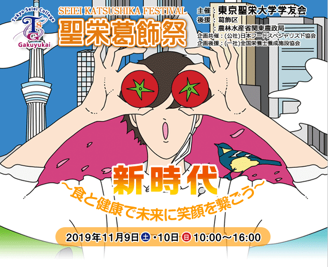 今年の聖栄葛飾祭のテーマは「新時代~食と健康で未来に笑顔を繋ごう~」です。平成から令和へ新元号となっても、健康を維持する食の重要性はどの時代でも変わらないことが伝え、食を通じて多くの方の健康と笑顔がみられる祭りにしたいと思い、このテーマを設定しました。本学特徴を生かし、食べ物を扱う団体が数多く出店しており、本学の学生が心を込めて調理を行っています。ご来店頂いた皆様に食の素晴らしさを少しでも感じて頂けたら幸いです。最後までお楽しみください。
