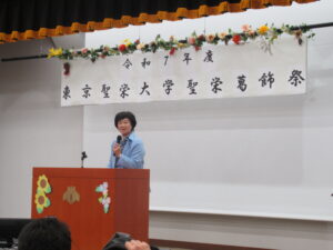 今年度のテーマは、「食で結ぶ、心を繋ぐ〜共に味わい、食から生まれる絆のひととき〜」です。このテーマには、地域との交流を深め、本学の事をより知っていただきたいという思いを込めました。またサブテーマには、聖栄葛飾祭を通して学生同士の絆を築き、その成果を皆様に発表する場としたいという願いを込めています。