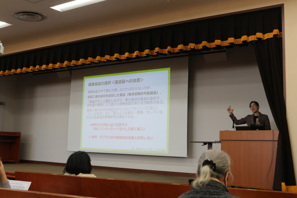 当日は、42名の方にご参加いただきました。講座の講師は、東京聖栄大学 健康栄養学部 食品学科 助教 の折口いづみ先生です。健康食品と一言で言っても、「特定の機能の表示ができるもの(保健機能食品)」と「そうでないもの」と種類があること、保健機能食品でも、その種類は国の審査や許可等の方法により、「特定保健用食品」「栄養機能食品」「機能性表示食品」などに区分されていること、その内容についてもお話いただきました。また、「健康食品」を選ぶときの目安となる認証マークについても具体的にお話いただいたほか、食品表示のルール、食品広告について、「健康食品」という言葉のみで「全て正しい」と盲目的に思うのではなく、信頼性を見極める方法など、実生活でも役立つ話をしていただきました。