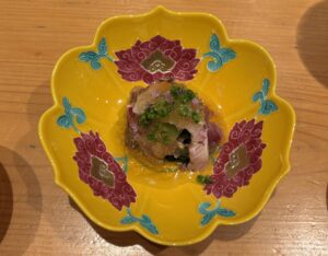 喜記のシェフにより、料理内容や食べ方についてご説明をいただきながら、料理はスープに始まり、揚げ焼き点心や炒め物の後、メインに真鯛の塩漬けレモン蒸し、蟹と干し貝柱の卵白チャーハン、デザートにさつまいもと生姜の温かいデザートが提供されました。
